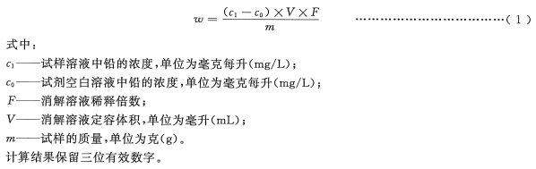 試樣中總鉛含量以鉛元素的質(zhì)量分?jǐn)?shù)ω計(jì),數(shù)值以毫克每千克(mg/kg)表示,按式(1)計(jì)算