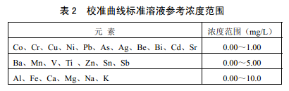 基于顆粒物樣品實際化學(xué)組成,表2 給出了標(biāo)準(zhǔn)溶液濃度參考范圍。建議在此范圍內(nèi)除 標(biāo)準(zhǔn)系列空白溶液(5.9),依次加入多元素標(biāo)準(zhǔn)儲備液(5.13 )配制3 ~5個濃度水平的標(biāo)準(zhǔn)系列。各濃度點用硝酸溶液(5.9)定容至50.0 ml。可根據(jù)實際樣品中待測元素濃度情況調(diào) 整校準(zhǔn)曲線濃度范圍。