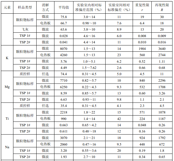 7家實驗室分別對統(tǒng)一提供的大氣顆粒物標(biāo)樣、濾膜質(zhì)控樣品、飛灰樣品(廢氣顆粒物模擬樣品)和2 個顆粒物負載量不同的TSP 樣品,同時取6 份平行樣品分別進行微波消解 (7.2.1.1 )和電熱板消解(7.2.1.2 ),用等離子體發(fā)射光譜法測量。對測定結(jié)果進行數(shù)理統(tǒng) 計,得到方法的精密度(各元素測定值的實驗室內(nèi)標(biāo)準(zhǔn)偏差范圍、實驗室間標(biāo)準(zhǔn)偏差、重復(fù) 性限和再現(xiàn)性限)和方法的準(zhǔn)確度(各元素測定值的相對誤差范圍和相對誤差最終值),詳 見附錄D。