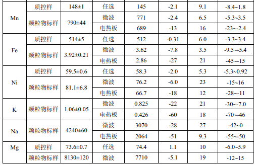 濾膜質(zhì)控樣品由美國職業(yè)健康研究所提供(A-3.1)。顆粒物標(biāo)樣為美國 NIST(1648a)。 樣品消解處理采用硝酸-鹽酸混合溶液(5.6),定容體積為 50.0 ml。不同類型樣品測定值濃 度(或含量)單位分別為:質(zhì)控樣(μg )、顆粒物標(biāo)樣(μg/g)、飛灰樣品(μg/g)和 TSP 樣品(μg/cm 2 )。其中顆粒物標(biāo)樣中 Al 、Ca、K 元素含量單位為重量百分比(% )。