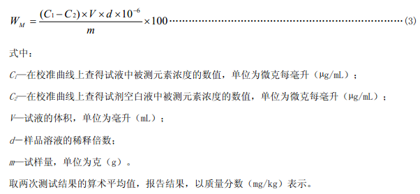 被測(cè)元素含量以質(zhì)量分?jǐn)?shù)WM計(jì),數(shù)值以%表示,按下式計(jì)算: