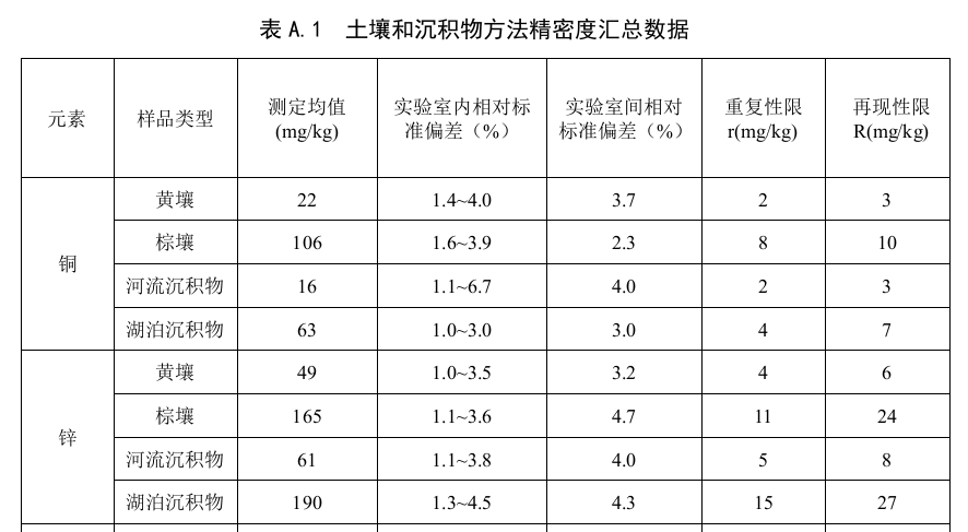 家實驗室對不同類型的土壤和沉積物統(tǒng)一樣品進行了測定,方法的重復性和再現(xiàn)性等精密度數(shù)據(jù)見表A.1。
