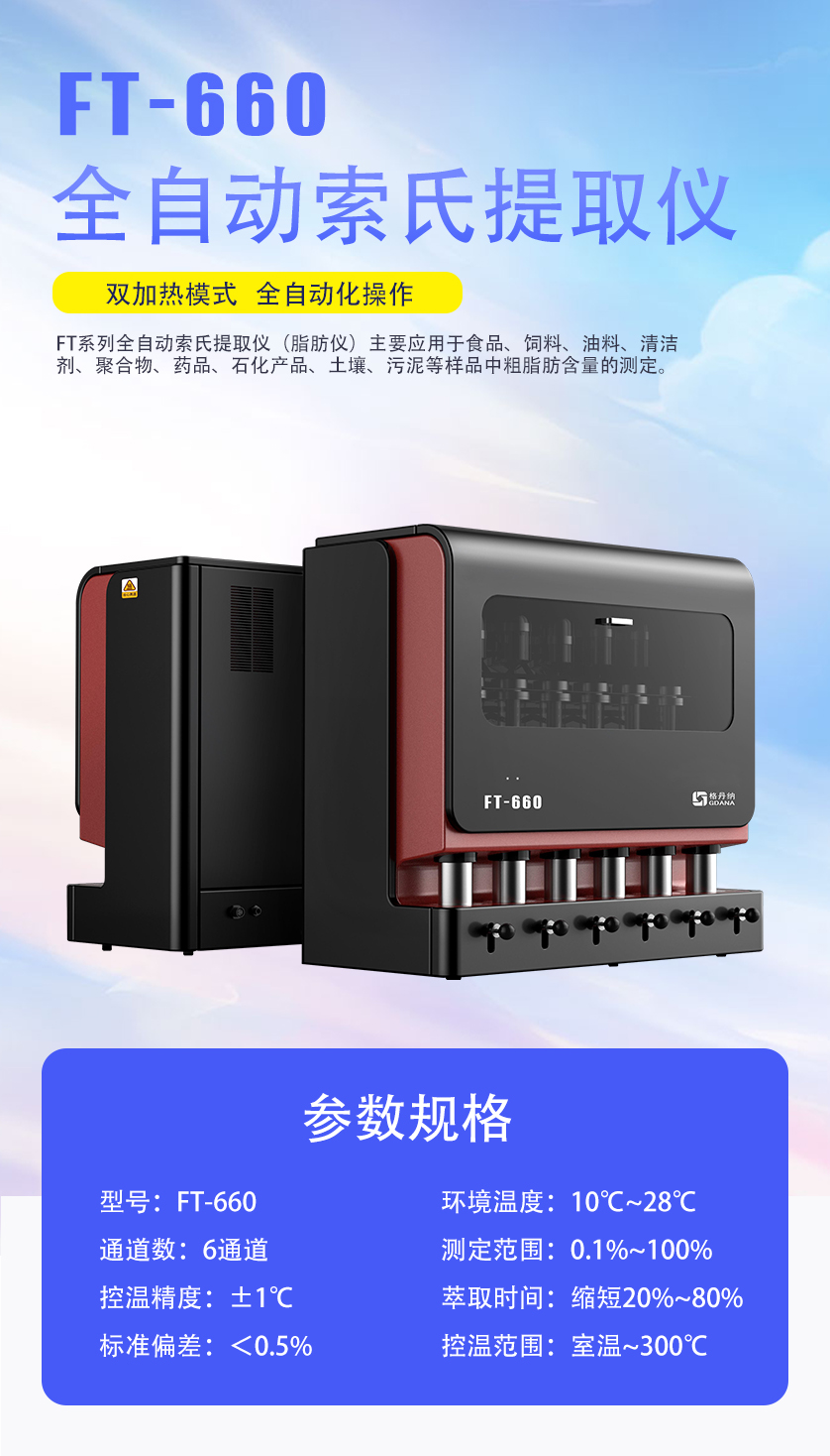 FT-660全自動索氏提取儀(脂肪測定儀)主要應(yīng)用于食品、飼料、油料、清潔劑、聚合物、藥品、石化產(chǎn)品、土壤、污泥等樣品中粗脂肪含量的測定。