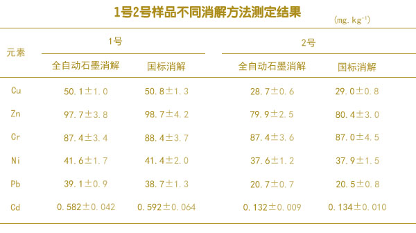 準(zhǔn)確稱取采集的樣品l號和2號樣品,分別使用全自動石墨消解法和國標(biāo)推薦法對樣品進(jìn)行消解處理,每個樣品每個方法分別消解6個,統(tǒng)一測定消解液中6種重金屬元素的含量測定結(jié)果如下表。由表中可知,全自動石墨消解法和國標(biāo)推薦方法的測定值基本趨于一致。