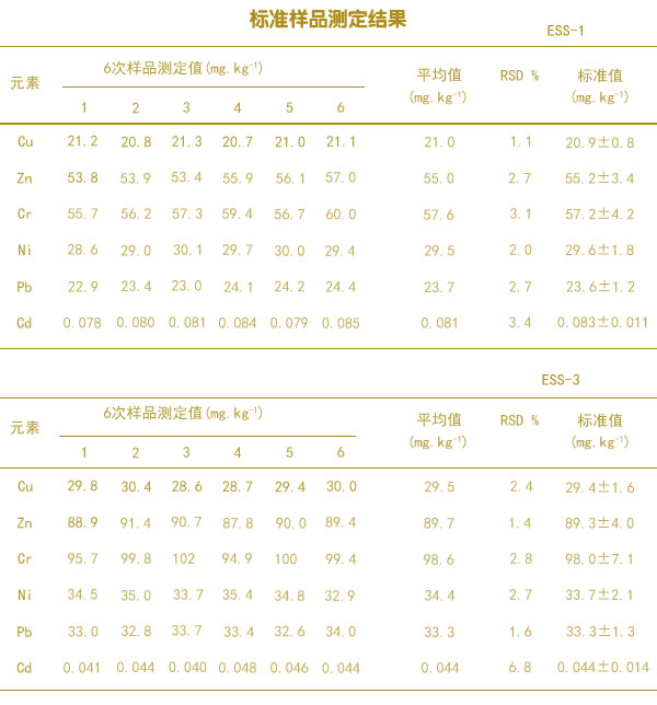 分別準(zhǔn)確稱取ESS一1和ESS一3標(biāo)準(zhǔn)土壤樣品各6份,標(biāo)準(zhǔn)樣品轉(zhuǎn)移至石墨消解儀樣品管中,放進(jìn)相應(yīng)的樣品位置,統(tǒng)一測定消解液中6種重金屬元素的含量,測定結(jié)果如上面的表格。結(jié)果得出2個土壤標(biāo)準(zhǔn)樣品中的6種重金屬元素測定值均在不確定度范圍內(nèi),且相對標(biāo)準(zhǔn)偏差均小于7%。