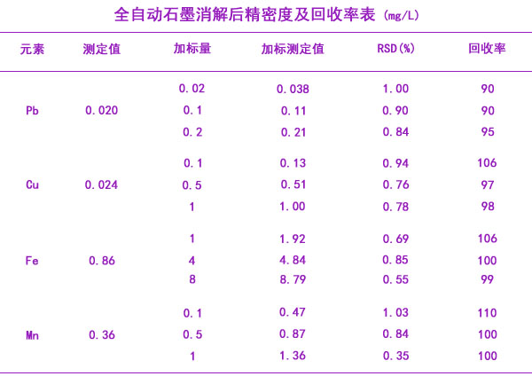 利用全自動石墨消解儀進行三次重復性消解葡萄酒中的鉛、鐵、銅、錳,分析測定精密度及回收率,實驗結果見表3,以取樣量5mL,定容至25mL計。