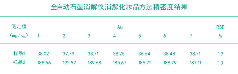 本文采用全自動石墨消解儀作為化妝品前處理消解設(shè)備進(jìn)行消解后測定化妝品中的金含量,加標(biāo)回收率為93.4%-99.4%,精密度也符合實驗要求,全自動石墨消解儀具有操作簡便快速、自動化程度高、重復(fù)性好、準(zhǔn)確性高的特點,適用于化妝品中金含量的測定。