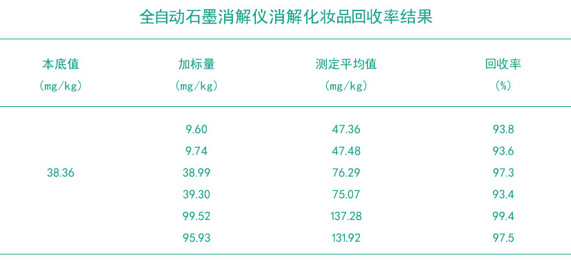 由上表可以得知,不同濃度樣品的加標(biāo)回收率均在93.4%-99.4%之間。表明此全自動消解儀濕法消解測定化妝品中的金含量準(zhǔn)確度較好。