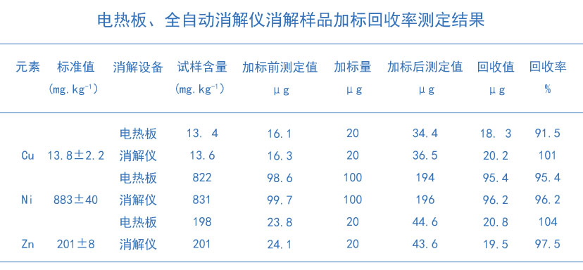 從上表結(jié)果所示:實(shí)驗(yàn)電熱板消解法消解測定后的元素加標(biāo)回收率在91.5%~104%,全自動(dòng)石墨消解法消解樣品后加標(biāo)回收率在96.2%~101%。兩種消解方法的加標(biāo)回收率均在80%~120%之間表明兩種實(shí)驗(yàn)消解方法都具有較好的加標(biāo)回收率。且全自動(dòng)石墨消解法的加標(biāo)回收率優(yōu)于電熱板消解法。