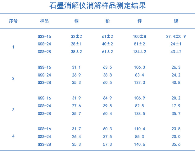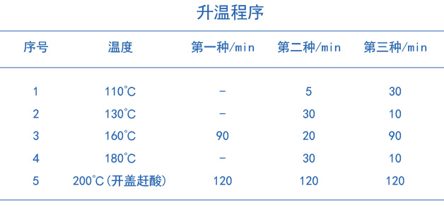 分別準確稱取(GSS-16)、(GSS-24)、(GSS-28)標準樣品各為0.200g置于聚四氟乙烯消解管中,用少量水濕潤,加入一定比例的硝酸、高氯酸、氫氟酸和鹽酸,按照無線平板上的程序升溫加熱(升溫程序如下圖表1所示),消解管加蓋,上機消解,開蓋,繼續趕酸至消解管內只剩下透明粘稠近干膏狀物,待消解管溫度降至室溫,取出消解管在通風櫥中,用慢速定量濾紙將消解后溶液過濾并用高純水定容至25mL容量瓶內,上機測定。樣品做三個平行,同時做試劑空白。