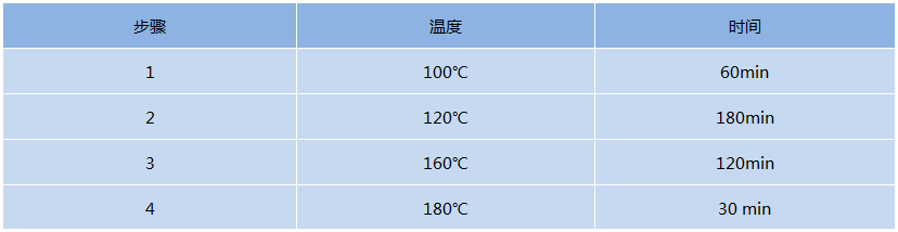 稱取0.2g(精確至0.1mg)樣品于聚四氟解管中,用少量水潤濕;加入5ml鹽酸。打開平板啟動設置好的程序開始加熱(消解程序下如表),100℃消解保持60min;加5ml硝酸、5ml氫氟酸、1ml高氯酸,加蓋,120℃消解保持180min;開蓋,160℃消解保持120min;最后溫度提高到180℃趕酸,當加熱至冒濃厚高氯酸白煙時,加蓋,待消解管壁上的黑色有機物消失后,開蓋,驅趕白煙并蒸至內容物呈不流動狀態的液珠狀。用1%硝酸溫熱溶解可溶性殘渣,轉移至25ml容量瓶中定容,搖勻,待測。同時做空白樣品。